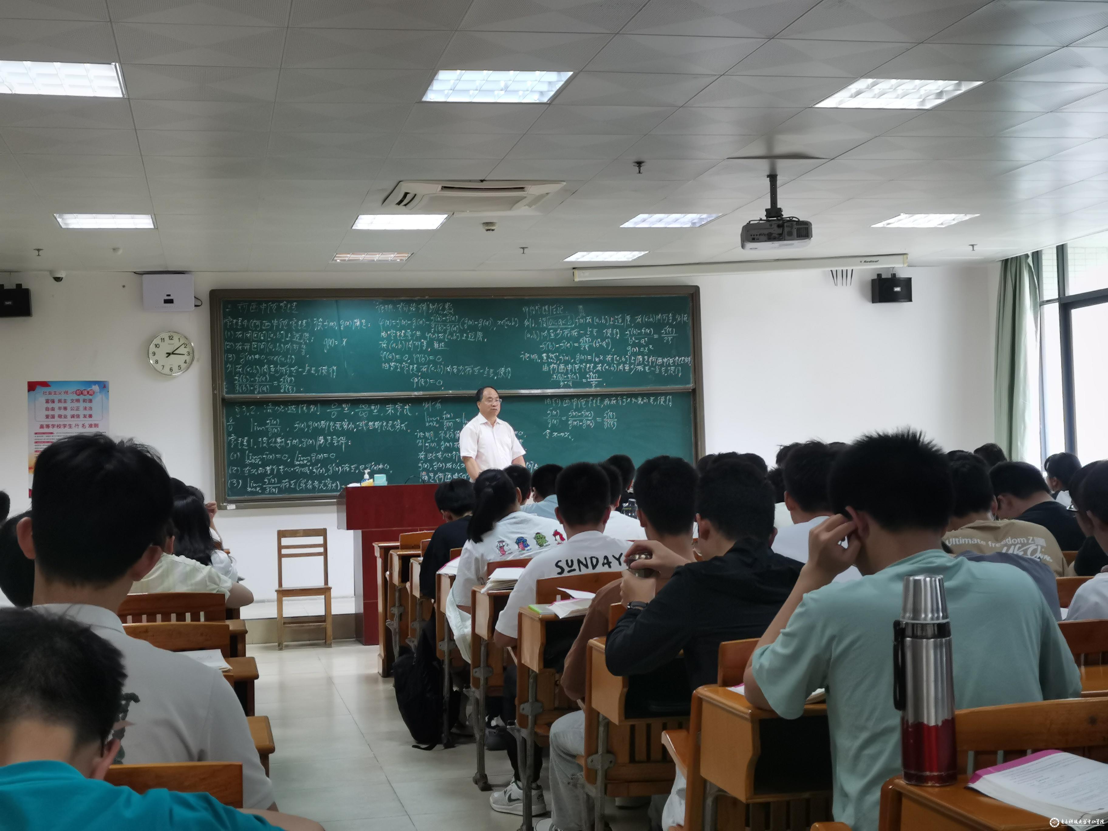 张法勇讲课的内容为《高等数学》上册的“柯西中值定理与洛必达法则”,该内容理论性强,抽象难懂。他利用有限的黑板,以其深厚的教学功底从定理的内容、证明到应用一气呵成,充分展示了自己的教学思路与教学难度。板书清晰分明,布局合理,并借助于难度逐层递进的例题来进行定理的应用,课堂丰富多彩,综合难度比较高。