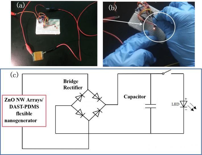 基于氧化锌纳米线阵列/DAST-PDMS的柔性纳米发电机的能量收集装置实物图和电路图