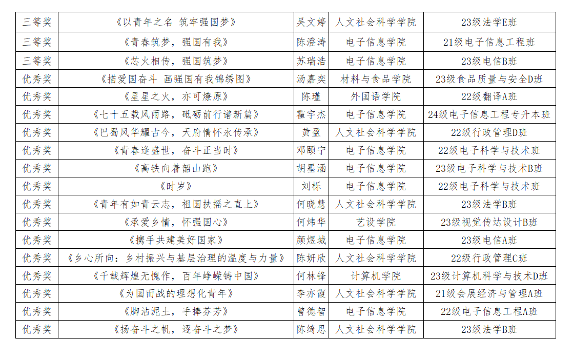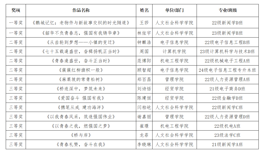 为庆祝中华人民共和国成立75周年,引导广大青年学生坚定理想信念,争做有理想、敢担当、能吃苦、肯奋斗的新时代好青年,学校党委宣传部举办了以“爱国奋斗 强国有我”为主题的征文比赛。自7月初发布比赛通知以来,得到了同学们的积极响应,共收到作品134份。经专家评审,共评出一等奖2名、二等奖5名、三等奖10名、优秀奖15名。获奖作品将通过学校官网、官微、校报等宣传平台进行展示并择优推荐至省市宣传平台,增进思想交流和互学互进,为强国建设、民族复兴伟业凝聚精神力量。