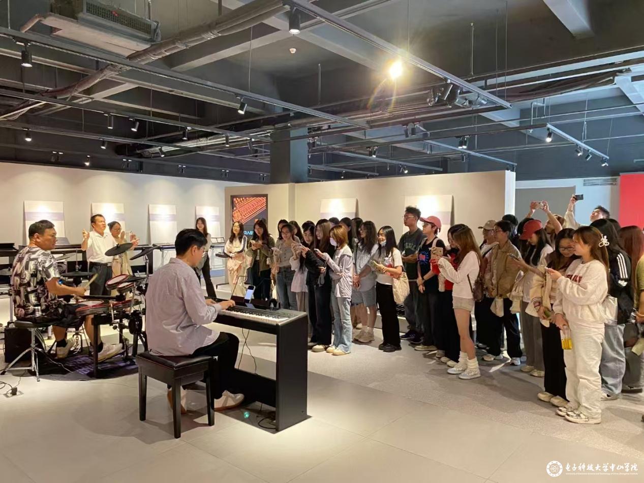 在展览厅,师生参观并现场体验了得理乐器的主要产品:架子鼓、电子琴、数码钢琴等。在公司员工的演奏下,师生共同合唱《歌唱祖国》,感受得理乐器优秀的企业文化。