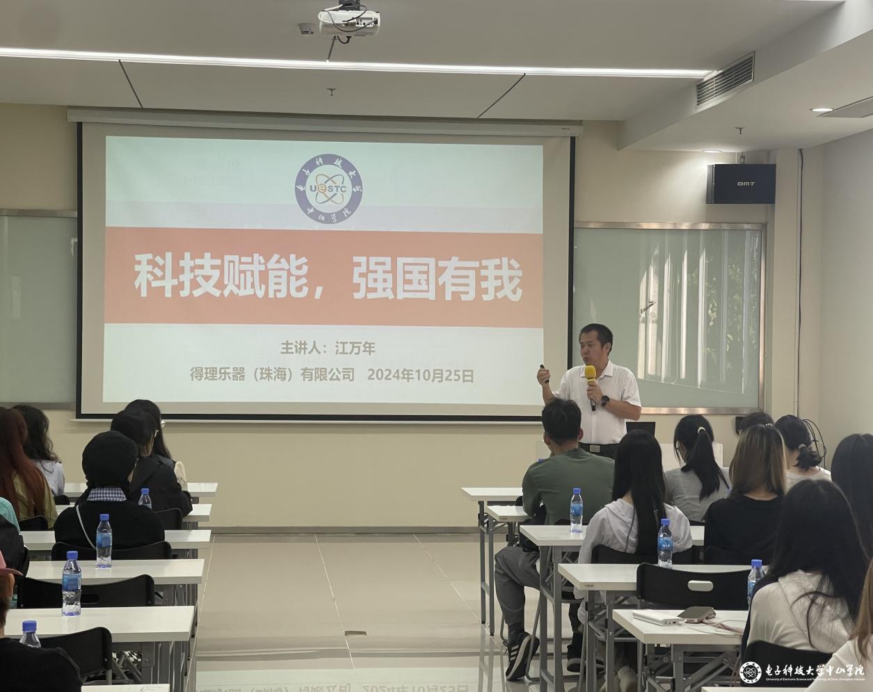参观结束后,江万年以“科技赋能 强国有我”为题向师生开展了创新创业专题讲座。他从得理乐器的发展历程入手,深入分析得理如何做到与时俱进,从企业发展角度讲述了如何为打造教育强国做好五举并重和人才赋能。对于创新创业,江万年结合自身经历及指导学生参加创新创业比赛的经验提醒同学们要积极创新,自我赋能,结合自身的优势与兴趣爱好做好职业规划。在讲座的结尾,他倡议所有同学要有“科技强国 奋进有我”的时代责任感与使命感,为科技创新提供新动力。