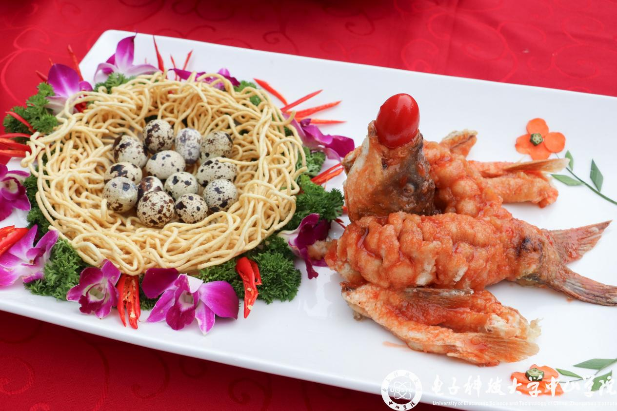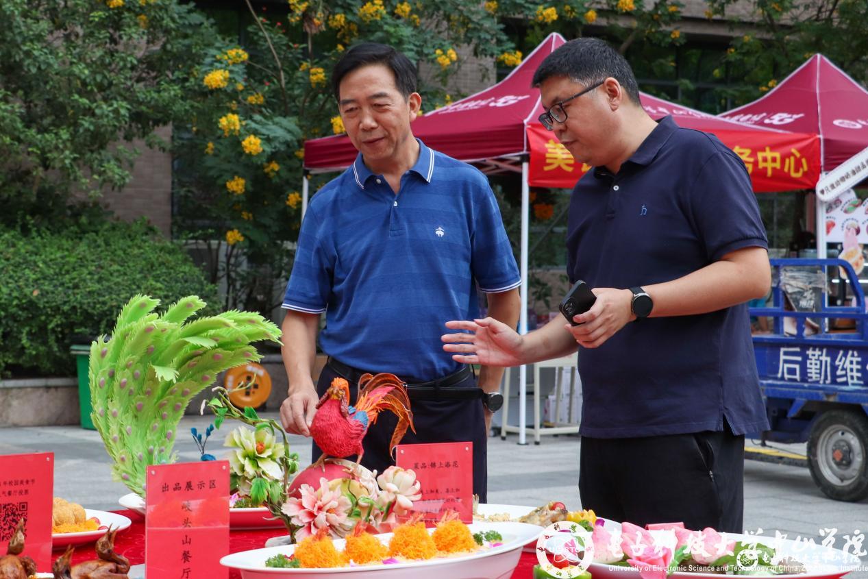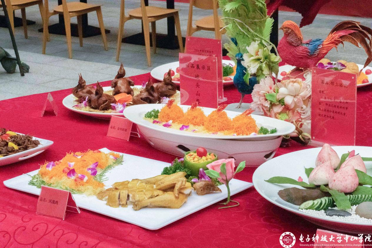 活动现场布置了四个菜品展示区,来自学校四大餐厅的24位厨师精选优质食材,各自献上自己精心准备的菜品,利用蔬菜瓜果装饰的乳鸽、水果造型的面点、春雁造型的红烧鱼、金黄酥脆的虾球......五花八门的美食,让闻香而来的师生眼花缭乱、流连忘返。活动现场还设有美食品鉴区,每个餐厅开放特色档口现场烹煮,师生们可以通过观看菜品的制作过程,进一步了解餐厅食材的品质。