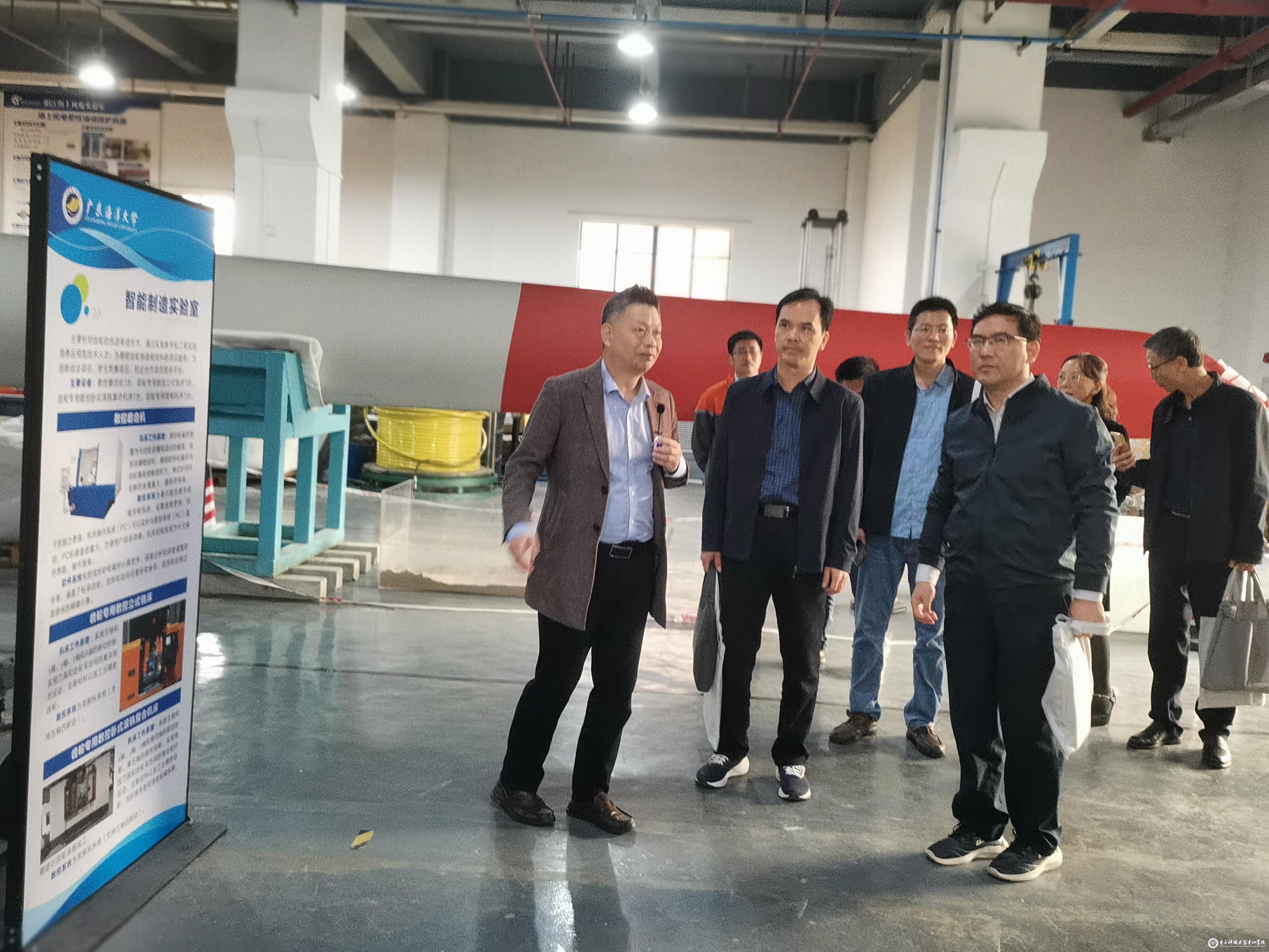 在陈扬枝、周荣伟的带领下,周文辉一行参观了空压机房、工业机器人多功能实训室、激光实训室、自动生产线控制(PLC)实验室、广东海洋大学-金风科技集团联合实验室等实验实训场所。